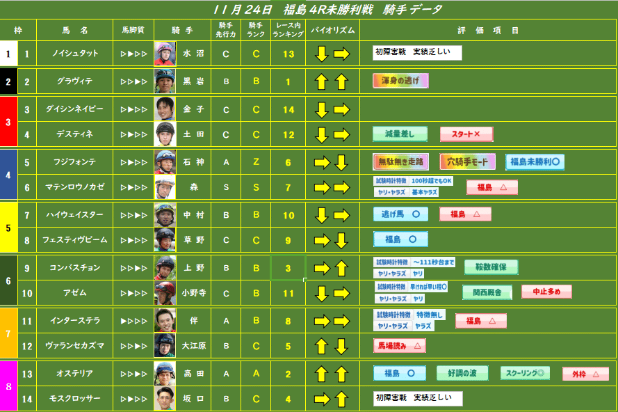 【福島障害未勝利戦】◎5 フジフォンテ 石神〇7 ハイウェイスター 中村▲13 オステリア 高田△8 フェスティヴビーム 草野×2 グラヴ···