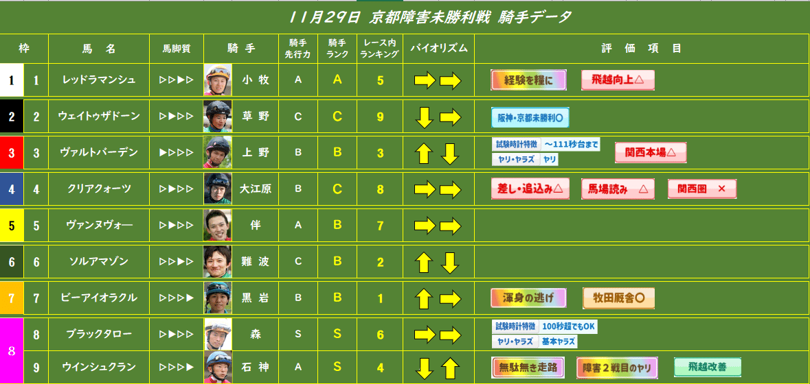 【京都障害未勝利戦】◎7 ビーアイオラクル 黒岩〇6 ソルアマゾン 難波▲2 ウェイトゥザドーン 草野△9 ウインシュクラン 石神×1 ···
