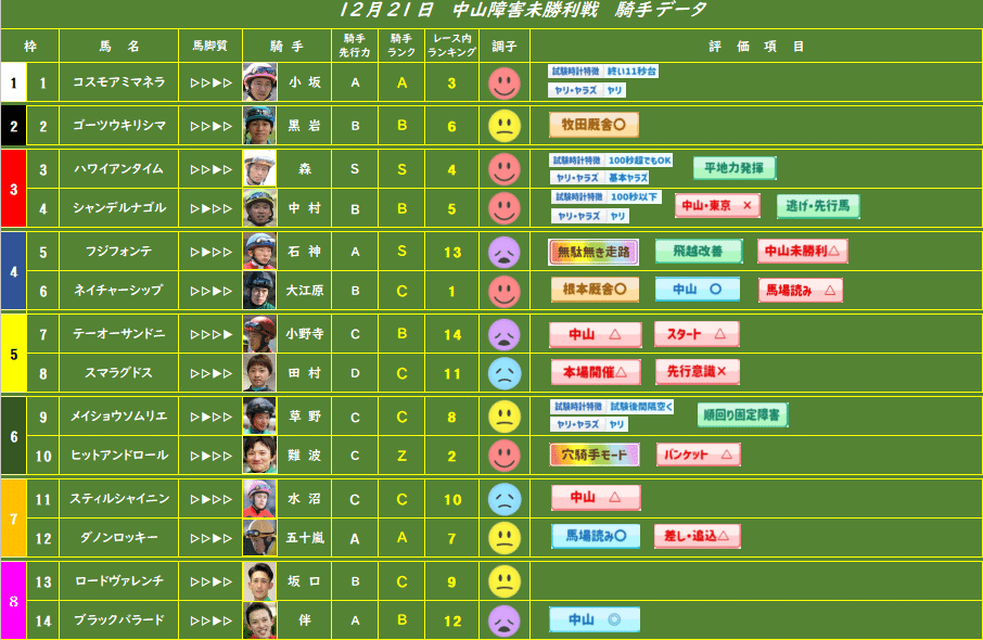 【中山障害未勝利戦】◎6 ネイチャーシップ 大江原〇14 ブラックバラード 伴▲2 ゴーツウキリシマ 黒岩△12 ダノンロッキー 五十嵐×13···