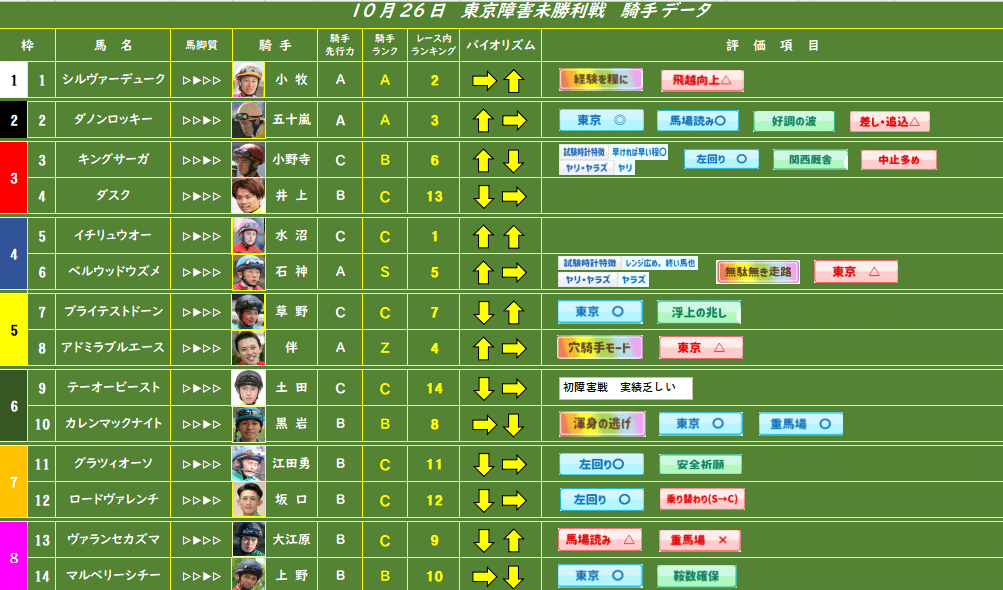 【東京障害未勝利戦】◎10 カレンマックナイト 黒岩〇3 キングサーガ 小野寺▲1 シルヴァーデューク 小牧△12 ロードヴァレンチ 坂口×···